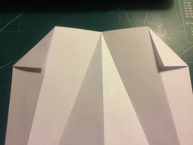 Dobla tu papel por la mitad lo largo. Luego tire del papel hacia abajo para que el pliegue se extiende desde el pliegue en la parte delantera que acaba de hacer y la esquina del papel en el otro lado. Repita en el otro lado. Tire del borde de esta capa hacia atrás, hacia el pliegue de cada lado y luego estos pliegues. Doblar los bordes en los dobleces como se muestra, el tirón de los pliegues de estos pliegues de la esquina en sí mismos como se muestra.