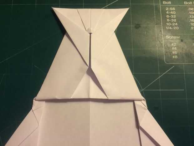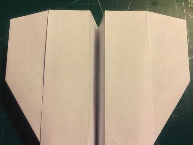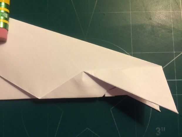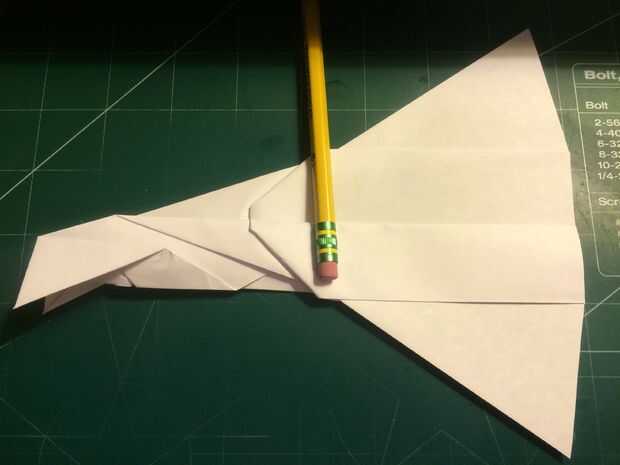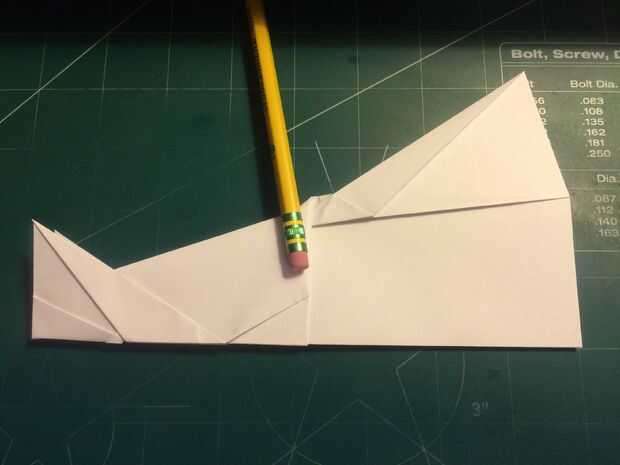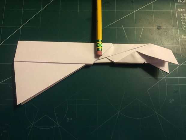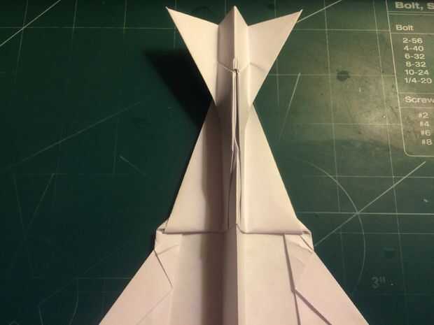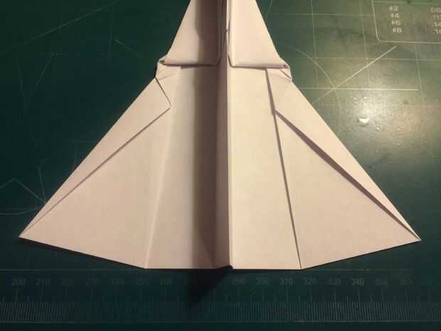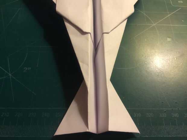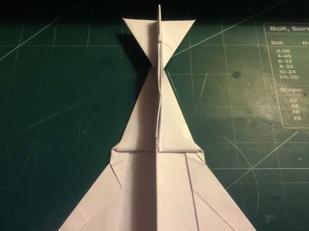 El avión del doblez por la mitad a lo largo del pliegue del centro, luego medir de 1 pulgada por encima del pliegue del centro a lo largo del borde posterior y haga una marca. Antes de plegar las alas hacia abajo, se abaten las canards. Doble las alas hacia abajo en la marca del borde de fuga. Alinee los bordes de fuga del ala con el borde posterior del fuselaje para mantener el ángulo de incidencia adecuado.