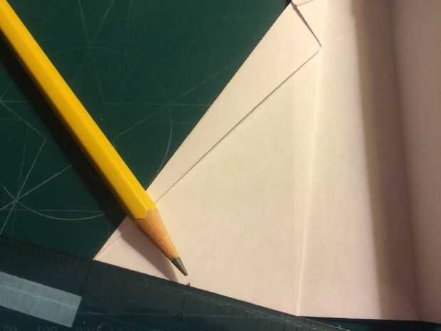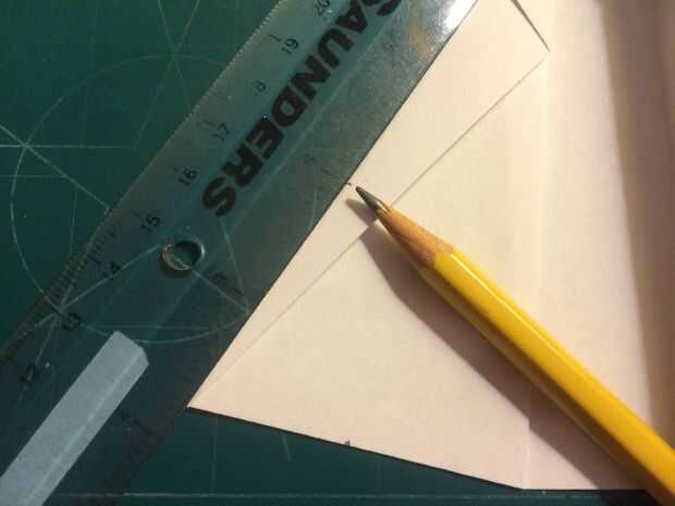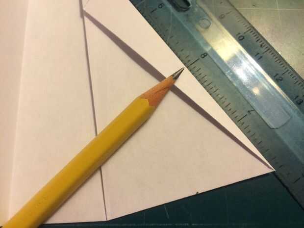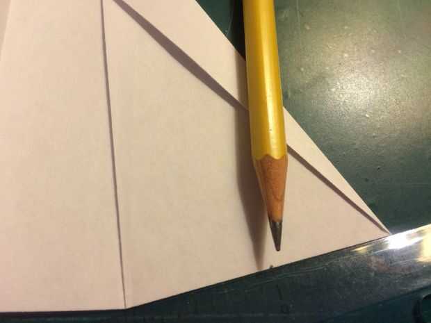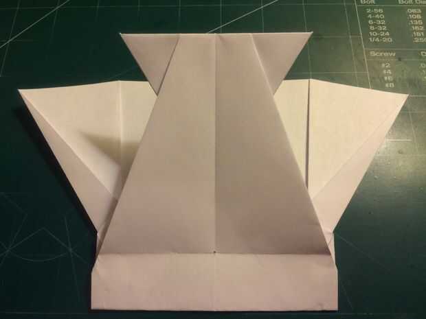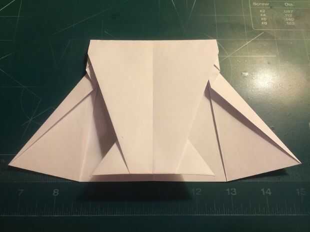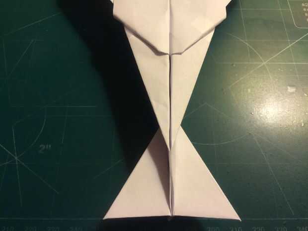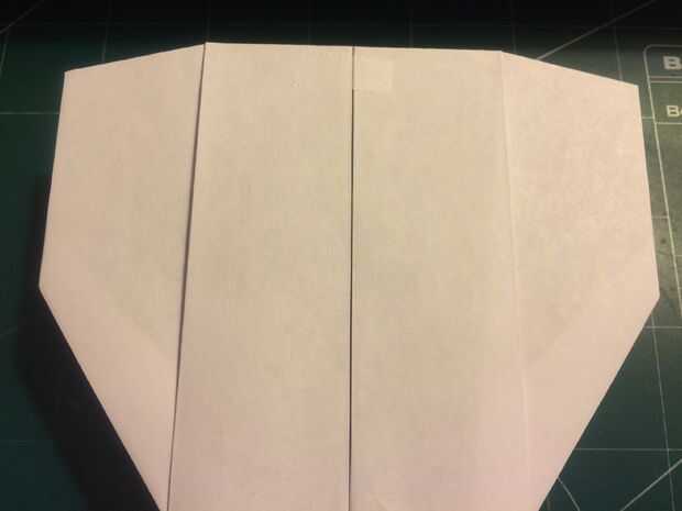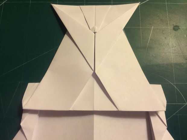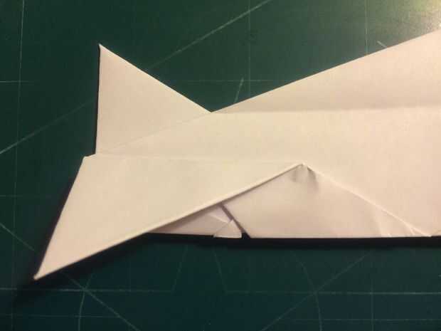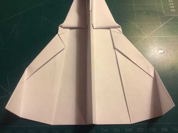 El avión del doblez por la mitad a lo largo del pliegue del centro, luego medir de 1 pulgada por encima del pliegue del centro a lo largo del borde posterior y haga una marca. Antes de plegar las alas hacia abajo, se abaten las canards. Doble las alas hacia abajo en la marca del borde de fuga. Alinee los bordes de fuga del ala con el borde posterior del fuselaje para mantener el ángulo de incidencia adecuado.