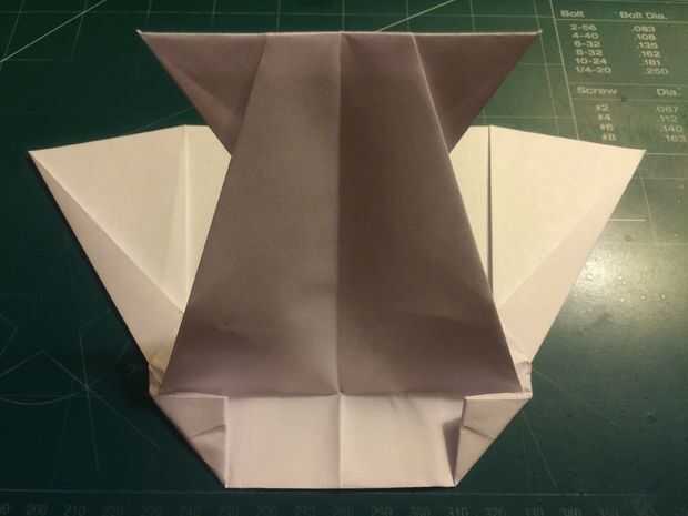 Tire la punta de la nariz y el borde posterior pliegue como se indica. Mide 1 pulgada de este pliegue en el pliegue de centro y haga una marca en este punto. Tire de la nariz hacia adelante otra vez y pliegue (Asegúrese de mantener la nariz recta, alineando el pliegue de centro con sí mismo). Después de hacer este segundo pliegue, desplegarlo y doblar las puntas hacia adentro como se muestra. Después de hacerlo, tirar de la nariz hacia adelante una vez más.