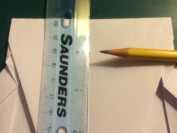 Para hacer las aletillas, tienes que hacer cuatro marcas. Mide 1 pulgada de cada extremo del ala a lo largo de los bordes de fuga de las alas y marcar como se indica. Después de hacer esto, medir 1,75 pulgadas de cada extremo del ala a lo largo de los bordes delanteros de las alas y marcar como se indica.
