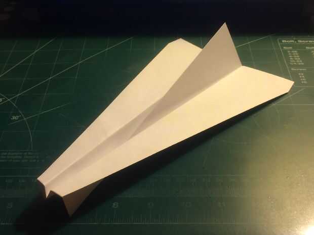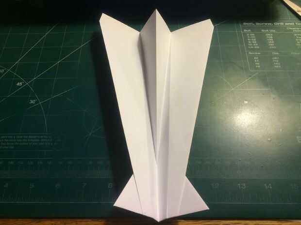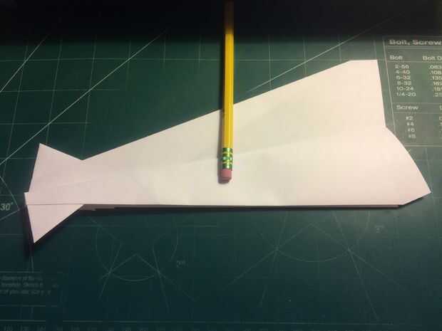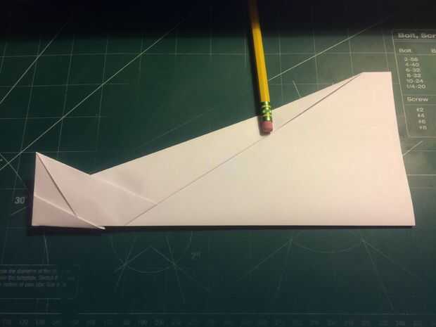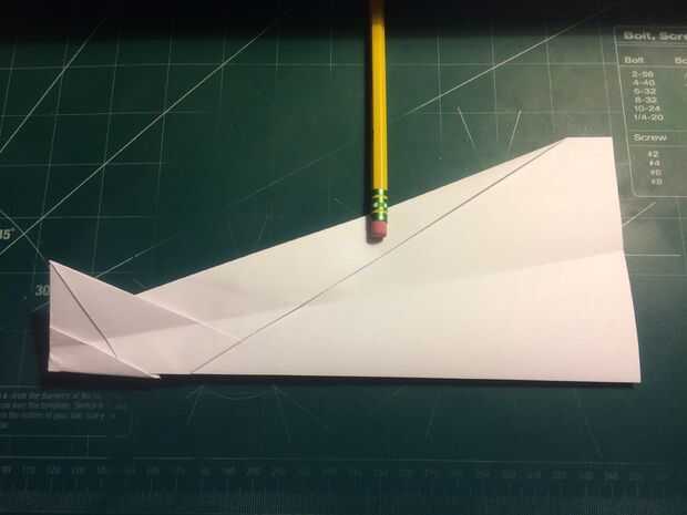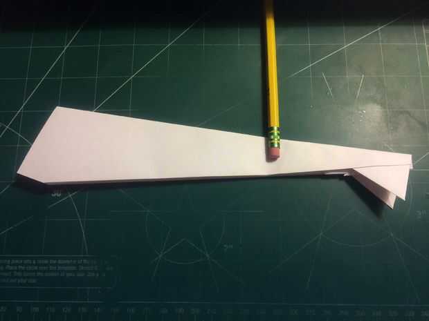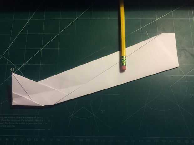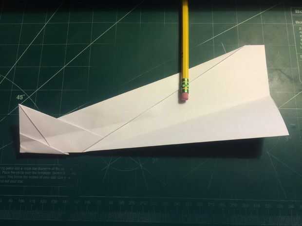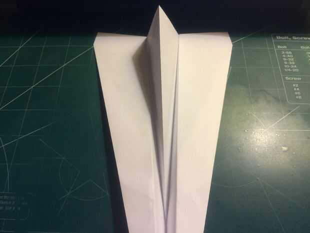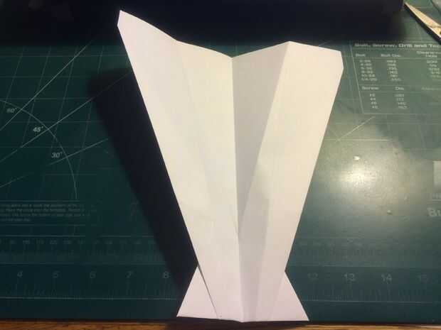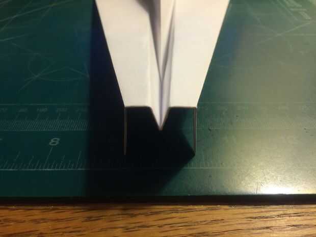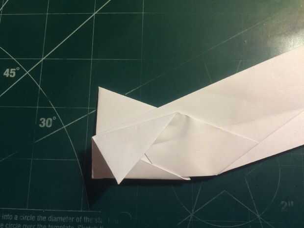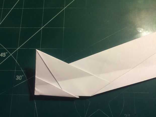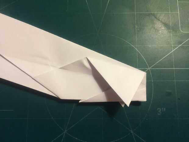 Doblar los bordes delanteros de las alas hasta el pliegue de centro del fuselaje. Después de hacer esto, doblar el pliegue de centro hasta el borde posterior de la superficie de sustentación y pliegue de este redil. Una vez hecho esto, abra el aeroplano y revertir los pliegues, tire la cola hacia arriba a través del centro del papel como se muestra. Restaurar los dobleces de ala y doblarlas hacia arriba con la aleta posterior entre ellos.