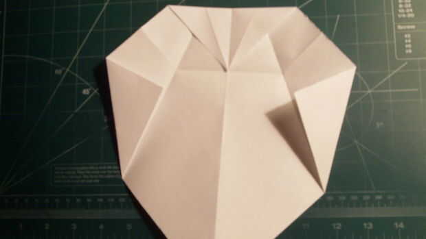 Doble la nariz hacia abajo hasta que su punta de media pulgada por debajo de los fondos de los dobleces de esquina hechos previamente, y luego volver a levantar la nariz y abrir. Doblar las esquinas no centrado así que conoce a su fondo paralelo con el pliegue que era perpendicular. Hacerlo en ambos lados. Antes de hacer cualquier otra cosa, también doblar la parte superior de la nariz al pliegue anterior de la nariz. Luego doblar todo a lo largo de los pliegues originales de doblez esquina.