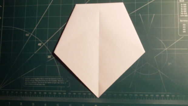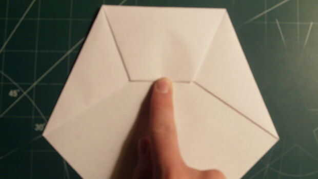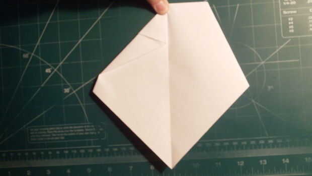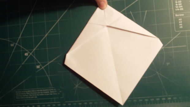 Doble el papel en el centro a lo largo del pliegue de la preexistente. Una vez hecho esto, el documento debe aparecer como se muestra en la segunda foto. Una vez hecho esto, doblar la parte superior de la nariz hacia abajo el otro pliegue preexistente. Voltee el papel y luego doblar las esquinas en el centro como se muestra.