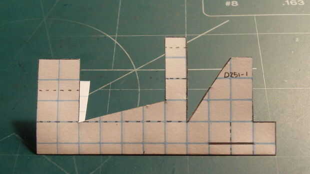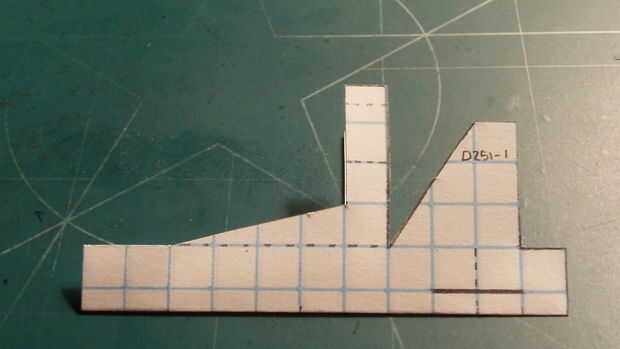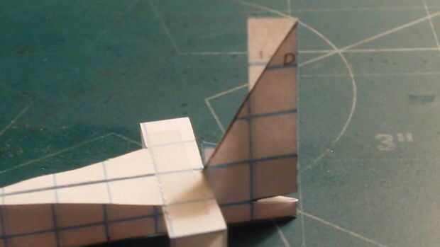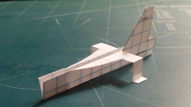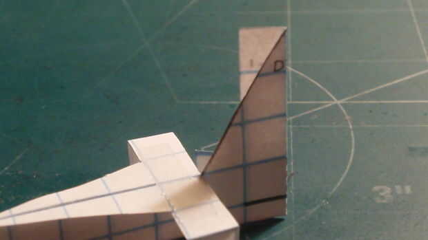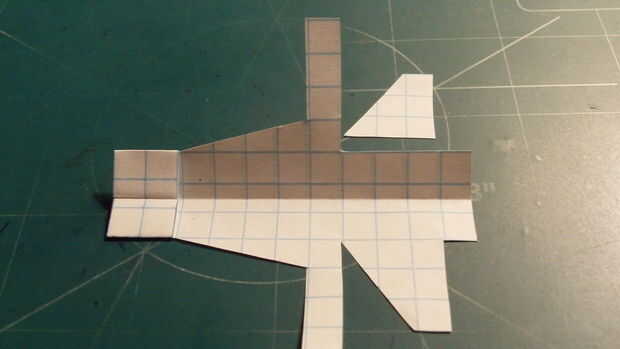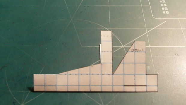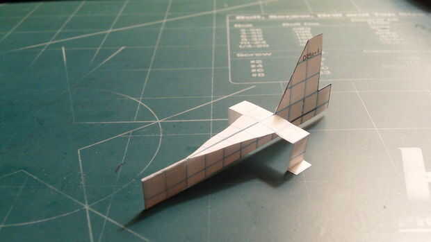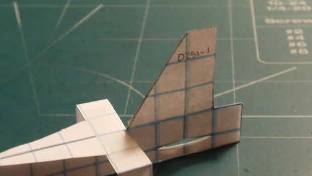 Cortar el fuselaje y pliegue el contrapeso en sí mismo como se muestra. Luego desplegar el fuselaje y corte el estabilizador vertical derecha. Entonces restaurar el pliegue. Aplique cinta de designado. Luego doblar el fuselaje hacia adelante en la línea vertical debajo del estabilizador vertical. Una vez haya hecho el corte a lo largo de la línea marcada, se despliegan.