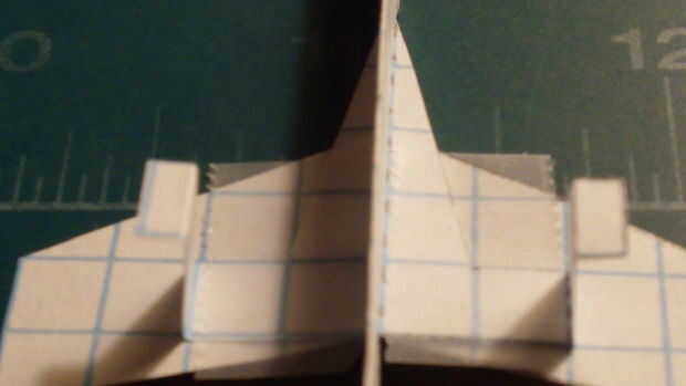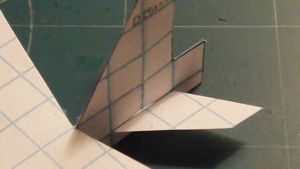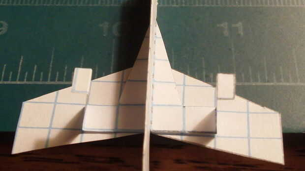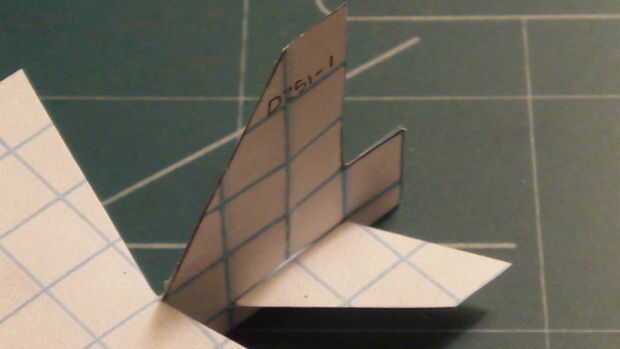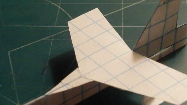 Una vez que ha terminado con las alas, cortar sus estabilizadores horizontales y deslícelos a través de la abertura en el fuselaje que formuló. Cuando a través, doble hacia arriba y aplique la cinta en la parte inferior; luego doble hacia abajo. Esto habrá completado su avión.