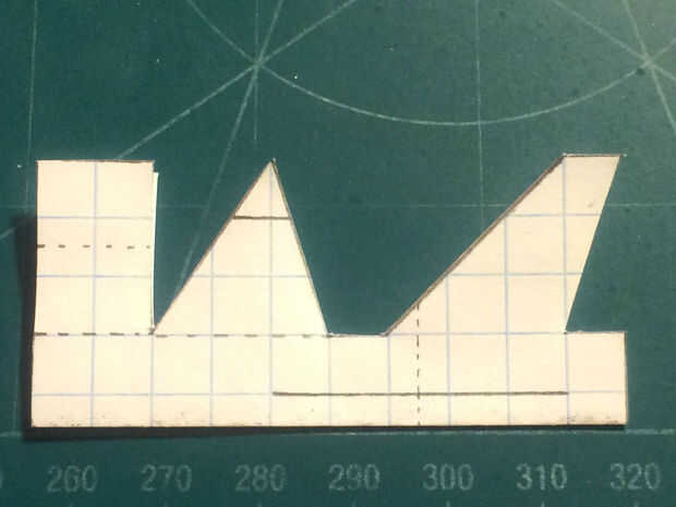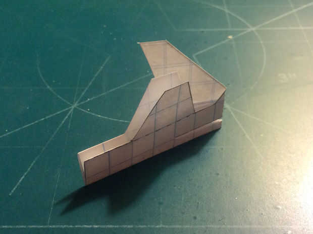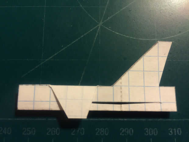 Cortar el fuselaje y doblar sus contrapesos en su lugar. Corte la aleta vertical extra. Una vez hecho esto, doblar a lo largo de la línea de puntos vertical y corte a lo largo de la línea horizontal continua. Una vez realizado el corte, suelte el pliegue. Doble hacia abajo las canards y cinta de designado.