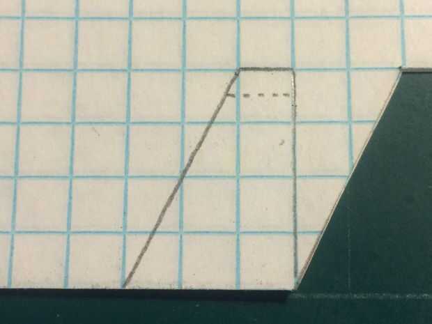 Después de que el fuselaje se hace, tomar otra hoja de papel que se dobla por la mitad a lo largo de las líneas de cajas. Marcar el ala como se muestra (1 caja de longitud por 4 cajas de ancho, con una porción barrida frente a este cuadro de 1 caja de acorde eliminado cada 2 cajas del fuselaje). Medir cajas de 0,5 de la punta del ala y hacer una línea punteada paralela al redil.