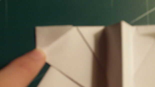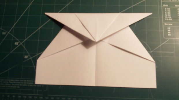 Doble la parte superior del diamante en la parte delantera hacia abajo en su otra mitad. Luego doblar el avión por la mitad a lo largo de su longitud. Para hacer las alas, doblar el les hacia abajo aproximadamente 1 pulgada del centro, paralelo a la tapa de centro. Para hacer el tren de aterrizaje, doblar las puntas de los canards para dirigirlo donde otra capa de papel emerge de la raíz del ala.