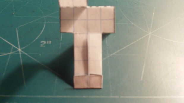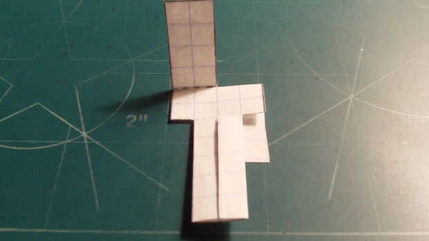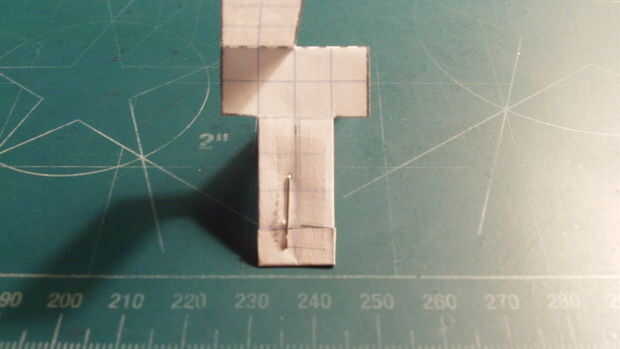 Doble hacia abajo el rotor izquierdo mientras que el lado de 'contrapeso' es hacia arriba. Voltee el helicóptero y doble hacia abajo el otro rotor. Entonces voltee el fuselaje detrás hacia el lado de 'contrapeso'. Tire de la fila inferior de cajas de longitud hacia arriba 1 caja por encima de la parte inferior de la armadura de avión. Luego la cinta estas cajas y el resto del contrapeso hacia abajo como se muestra. Aplicar 1 grapa a lo largo de la línea central del fuselaje. Su Hoverfly está ahora completa.