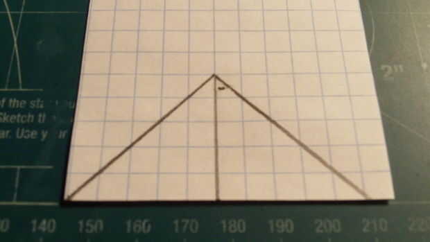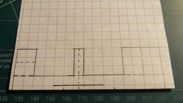 En primer lugar, comenzar por plegamiento eres tu papel milimetrado en la mitad (excepto tres cajas en el lado perforado). Una vez que el papel ha sido doblado adecuadamente, haga dos marcas--15 cajas full apart. Use una regla para hacer una línea recta con una longitud de 13 cajas directamente a 1 fila de cajas de las dos marcas que acaba de hacer. Luego realizar los elevadores, timón de largueros y contrapeso como se indica. Siga las marcas de la fotografía. Entonces, dos cajas de la parte trasera del contrapeso, marque una línea que se extiende 5 cajas más atrás. cajas de 2,5 desde el comienzo de esta línea, hacer una línea de puntos vertical. Una vez que todo está marcado hacia fuera, cortar el fuselaje.