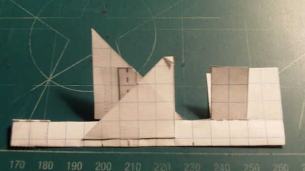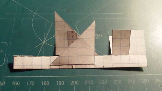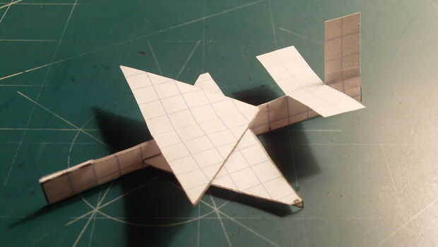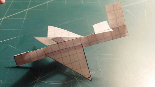 Para el ala más baja, separar el fuselaje por el corte que hiciste. Después el ala a través del fuselage y tire de la mitad de él a través con él en una configuración delta regular. Luego doblar las dos mitades a cada lado del fuselaje. Luego aplique un pequeño trozo de cinta en la parte inferior de las alas mientras que se doblan para arriba a ras con el fuselaje. Una vez hecho esto, se abaten las aletillas a lo largo de las marcas de media caja realizadas en los extremos del ala. Una vez que has terminado con las alas, aplicar tres grapas en la zona del contrapeso.