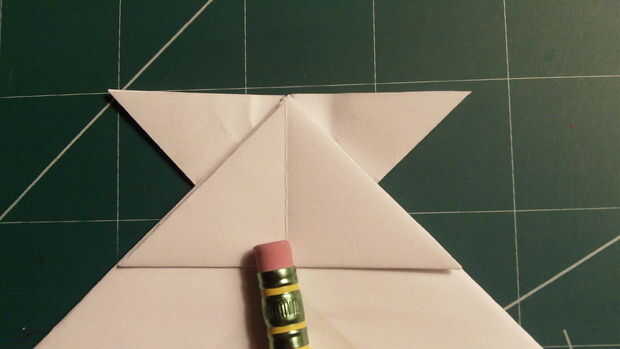 Fold the counterweight out flat. Luego, tirar adelante sus puntas externas. Voltee el papel y tire hacia atrás esos mismos consejos. Luego tire la otra capa sobre ellas.