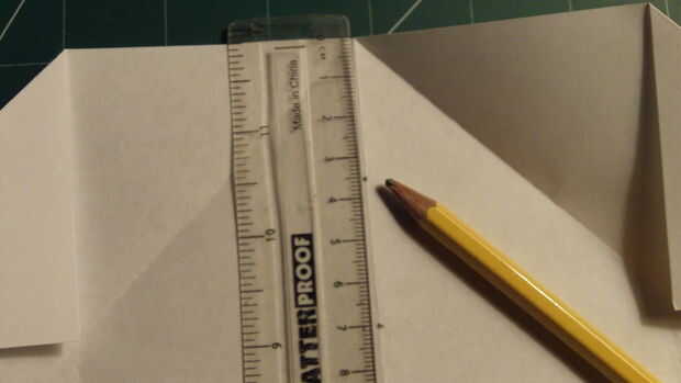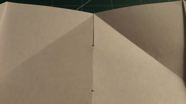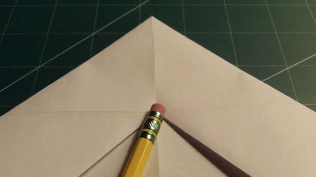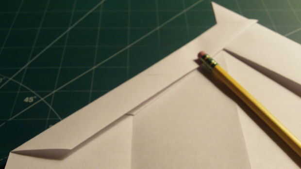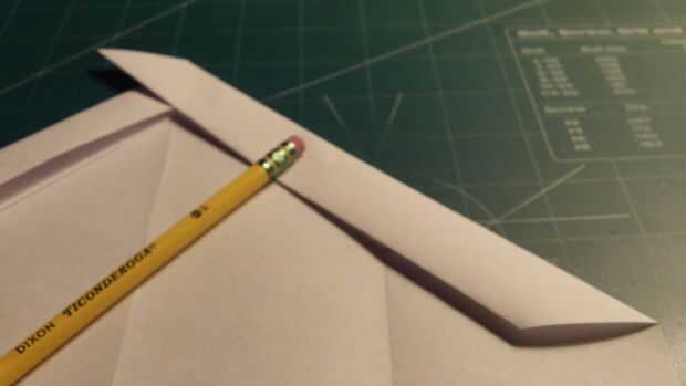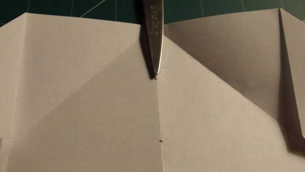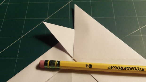 Hacer una marca justo detrás del punto donde se unen los pliegues de la esquina a lo largo del pliegue de centro. Entonces se despliegan el segundo conjunto de pliegues de la esquina, pero no el primero. Medir la mitad de la distancia de la marca y la punta de la nariz y luego márquelo. Hacer un corte desde la punta de la nariz hasta la marca media. Doblar los pliegues esquina segunda vuelta otra vez, y entonces tire sus bordes de ataque a sus espaldas para hacer las superficies de sustentación. Como esto se hace, quitando las partes colgantes sobre a los lados del originales, haciendo que los canards.