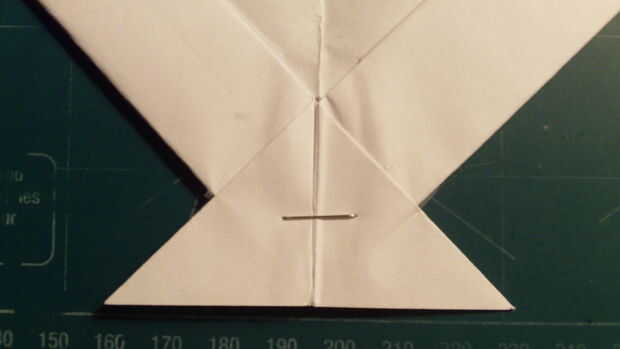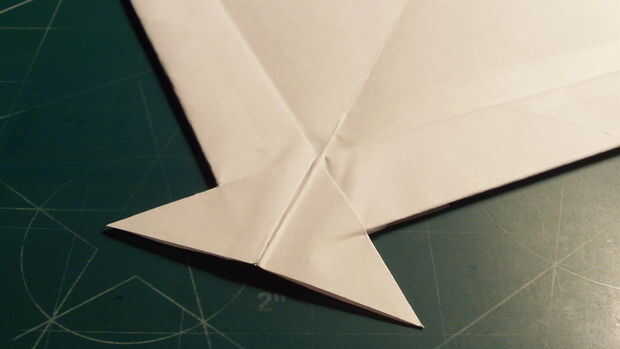 Ahora toma la armadura de avión y darle la vuelta a su lado "limpio". No dañar las aletas mientras que hace tan. Coloque el contrapeso en la parte delantera del avión, justo detrás el canard. Aplique la cinta alrededor de ella para asegurarla. Entonces voltee el aeroplano y aplicar 1 grapa a la parte delantera, donde el pato se encuentra con el borde de ataque del ala y viceversa.