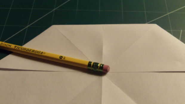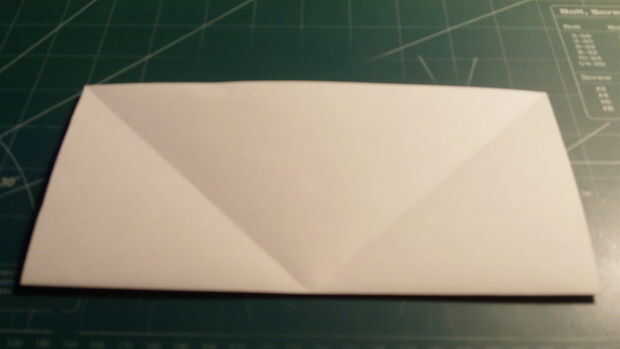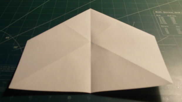 Fold your paper up in half. Tire dos de las esquinas hasta el doblez del centro. Luego colocar el papel para que los dobleces de dos esquina están en la parte inferior. Apriete la nariz a donde terminan los pliegues de la esquina en el otro lado del papel. Luego Dale la vuelta vuelta y vuelva a tirar los rincones.