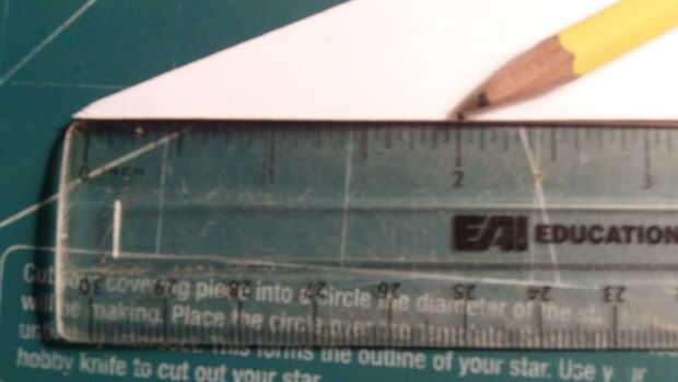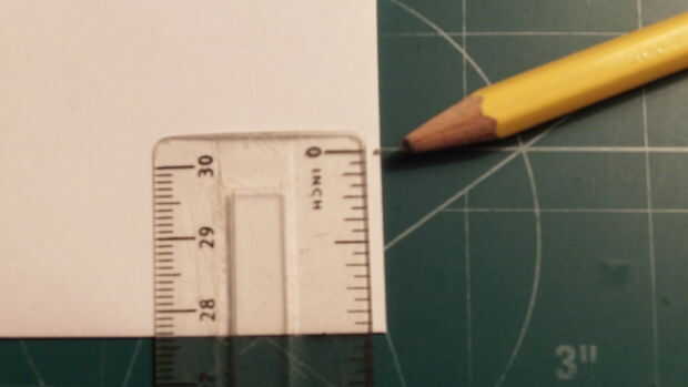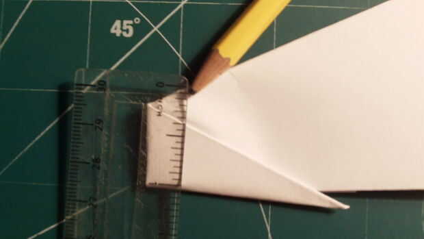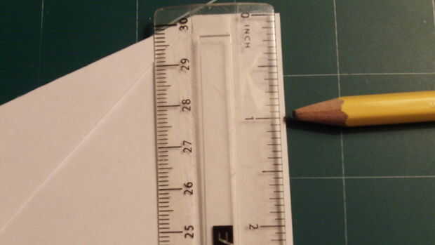 Comenzar el paso haciendo una marca de dos pulgadas de la punta de la nariz. Cuando se despliegan las dos mitades del papel, apriete la nariz para que el pliegue es en este punto. Luego vuelva a alinear la regla por lo que es paralelo al borde de fuga y marcar 1 pulgada en los bordes de fuga y líderes.