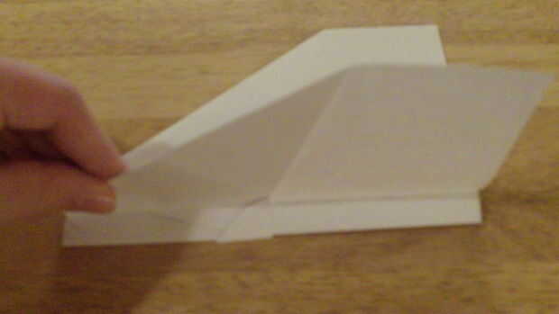Desde su posición anterior doblar el avión a la mitad. Luego plegar las alas aproximadamente 3/4 pulgadas desde la parte inferior. Repita en el otro lado.