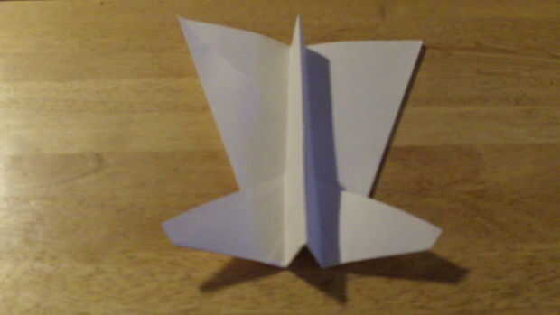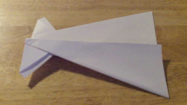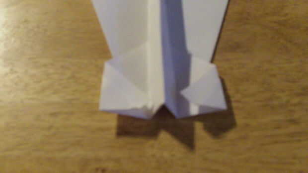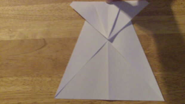 Tire de la punta frontal hasta la parte inferior de lo que fue el alero. Luego doblar el avión a la mitad. De 1 pulgada sobre el centro, doble las alas hacia abajo. Una vez que las alas se doblan, voltear el avión sobre su parte posterior. A partir de ahí, incorpore el engranaje hacia el fuselaje. El ángulo del doblez debe ser paralelo con el fuselaje. Esto puede ser comprobado y aseguró alineando la parte delantera del engranaje con el borde de ataque del ala.