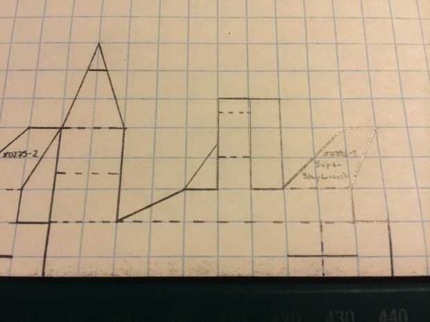 Iniciar la construcción de su Super SkyLocust por esbozar el diseño aparecido en la primera foto. El papel de gráfico que esto se hace en el debe tener un conjunto de cuadros doblada por la mitad en su pliegue. El fuselaje es de 10 cajas de longitud y tiene un contrapeso de 3 por 2 casillas. Una caja de la parte posterior del fuselaje, hacer una sólida línea a lo largo de las cajas de línea 0,5 gráfico por encima del pliegue que se extiende 2 casillas adelante. Entonces 2 cajas hacia el interior de la parte posterior del fuselaje, hacer una línea vertical punteada. El trazado de las líneas es complejo, por lo que es más fácil mostrar que explicar. Proceda a recortar entonces.