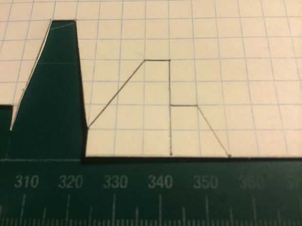 Después de que el fuselaje se hace, tomar otra hoja de papel que se dobla por la mitad a lo largo de las líneas de cajas. Marcar el ala como se muestra (1 caja de constante acorde a la raíz, con el borde posterior rectangular 1 por 3 detrás de un área de caja de 2 por 3 del ala con un barrido de 2 cajas de acorde eliminado cada 3 cajas de fuselaje). Luego cortar el ala. Medir 2 cajas a lo largo del pliegue, medir dos cajas hacia arriba de una marca y hacer otro punto. Luego trace una línea diagonal conectar esta nueva marca a la que más lejos. De la marca que acaba de realizar, medir una caja más lejos de la ahora conectado a la línea y haga una marca. Esboce una línea entre esta marca y la otra marca a lo largo del pliegue. Luego corte los estabilizadores horizontales.