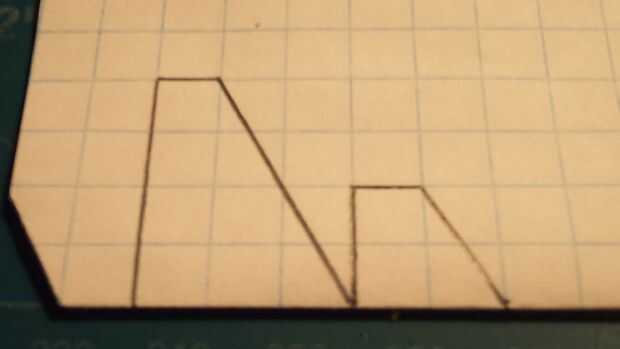 Después de que el fuselaje se hace, tomar otra hoja de papel que se dobla por la mitad a lo largo de las líneas de cajas. Marcar el ala como se muestra (1 caja de longitud por 4 cajas de ancho, con una porción barrida frente a este cuadro de 1 caja de acorde eliminado cada 2 cajas del fuselaje). Adicionalmente, la medida 2 cajas a lo largo del pliegue y 2 cajas arriba de un lado y hacia adelante el 1 cuadro. Luego trace una línea diagonal que conecta esta línea el otro borde de la línea a lo largo del pliegue. Esto hará que los estabilizadores horizontales. Luego recórtalo.