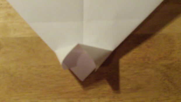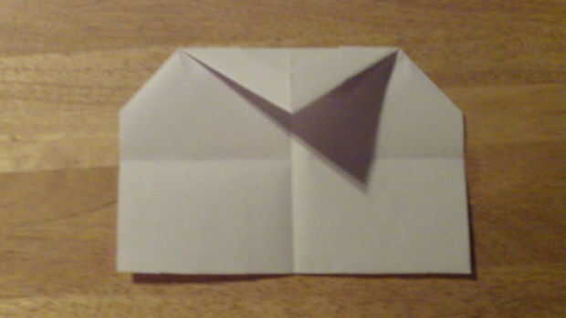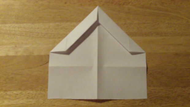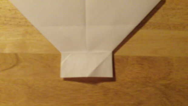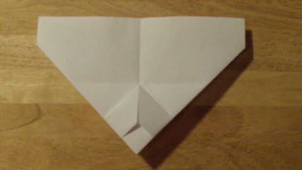 Lay your airplane out flat. Voltee el papel y tire de la parte superior hasta el pliegue por debajo de ella. Luego, otra vez se voltea el papel y jale las esquinas en el centro. Una vez hecho esto, voltee el papel para que una tercera y última vez para empezar a hacer el canard sí mismo. Abra el documento como se muestra.