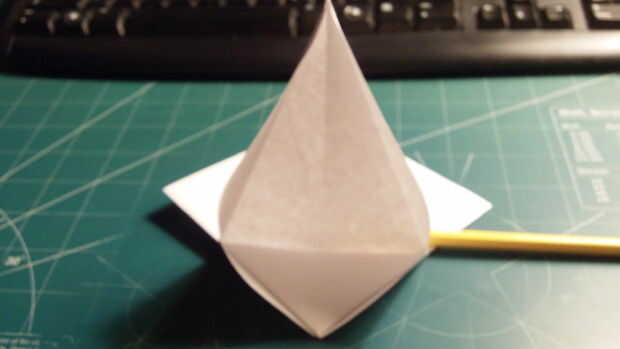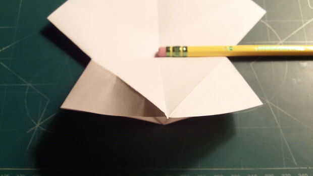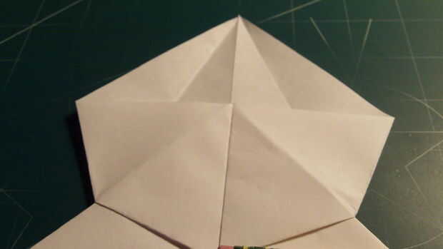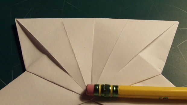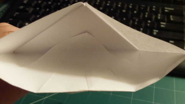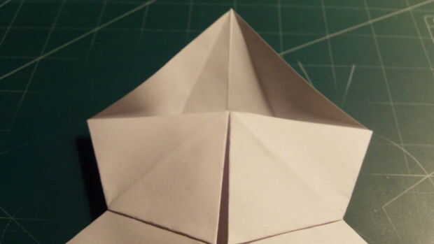 Desde su posición en el último paso, el aeroplano de papel debería tener ahora el lado opuesto hacia arriba. Desde allí, abra los pliegues y luego aplanarlos como se muestra. Después de eso, darle la vuelta para que el otro lado ahora es hacia arriba. Doblar la sección triangular pequeña de papel en la aleta de canard, como en la imagen.