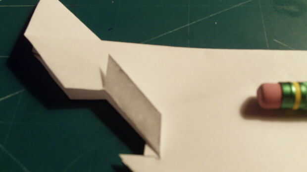 Doblar sus alas de aviones hacia abajo y medida 1 pulgada hacia el exterior del fuselaje a lo largo del borde posterior. Hacer una marca y la medida pulgadas otro más y hacer otra marca. De cada una de estas marcas, medir hacia adentro mientras que es paralelo al fuselaje 3/8 de pulgada. Luego corte a lo largo de estas líneas. Una vez cortadas, doblarlas tanto arriba y doble como se muestra.