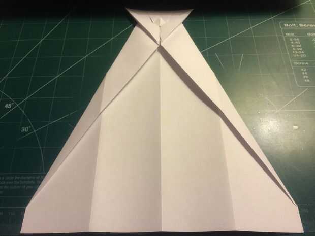 Tire de las puntas del papel a lo largo de los bordes de fuga en el doblez de centro y pliegue para hacer los pliegues cuarto. Después de hacer los pliegues, se despliegan. Tire hacia atrás el borde romo de avance del papel al borde de fuga y pliegue. Con esto hecho, vuelva a tirar la nariz adelante, deteniéndose en la parte donde la parte delantera encuentra la parte posterior de la superficie de sustentación en cada lado. Después de hacer esto, deshacer este redil y tire los consejos de esta sección en el pliegue como se indica. Apriete la nariz hacia adelante otra vez.