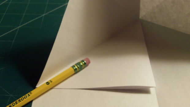 Remeter el papel debajo de sí mismo. Las fotos representan lo que el documento debe aparecer como. Luego tire de la cubierta esquinas del pliegue hacia adelante en la parte delantera.