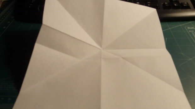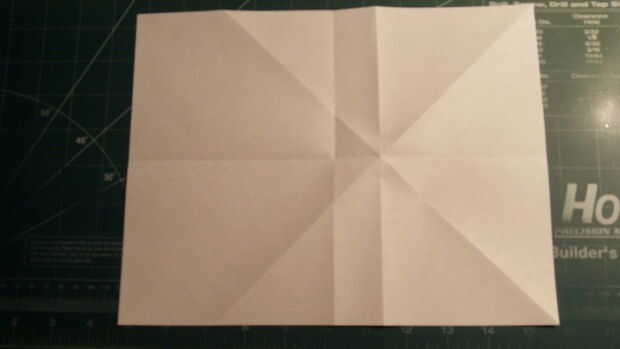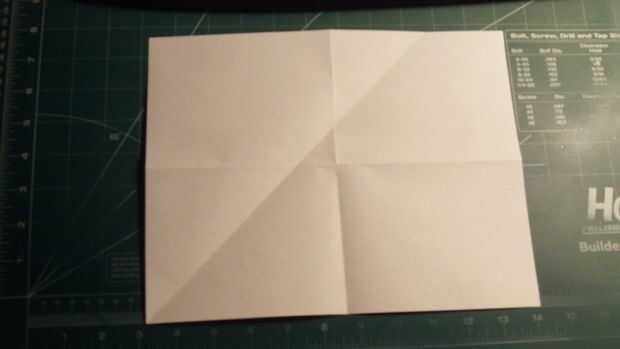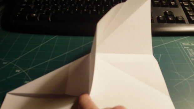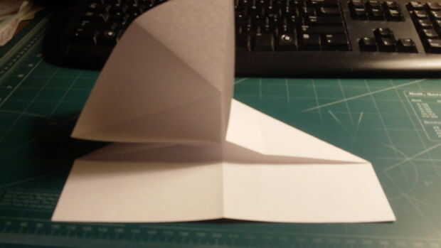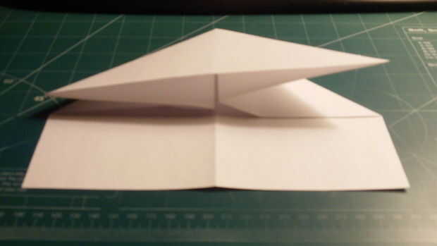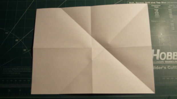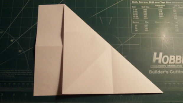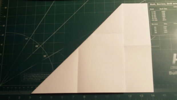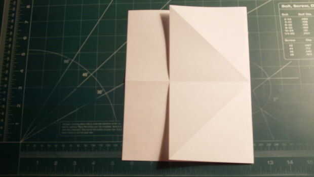 Tire del papel desde una esquina de la hoja hacia el lado opuesto. Repetir este proceso en el otro lado del papel también. Una vez que las esquinas han sido dobladas al lado opuesto del otro, tire del papel hacia abajo para tener el "X veces" superposición y forma una "V". Proceder para luego meter el papel debajo de sí mismo así que finalmente tiene forma afilada nariz triangular.