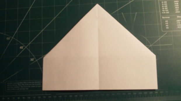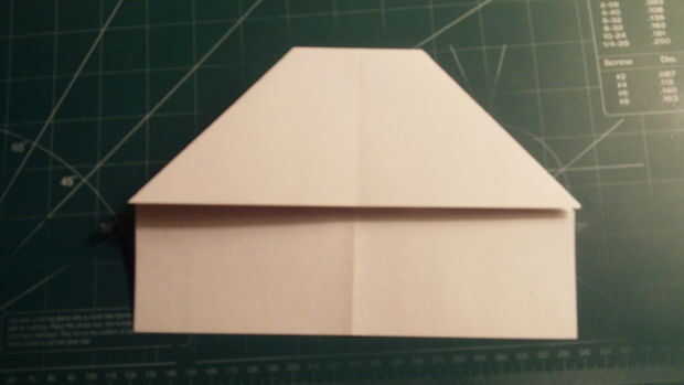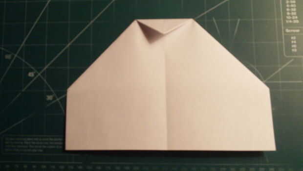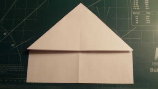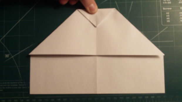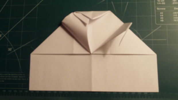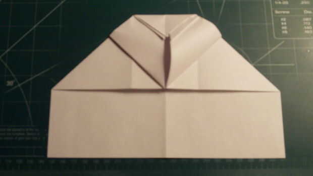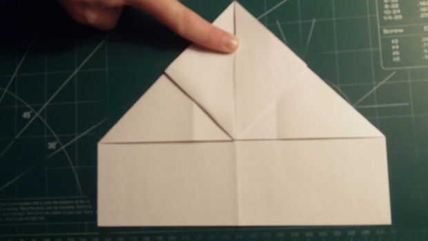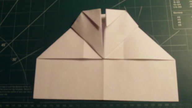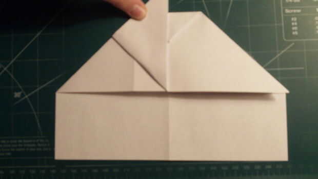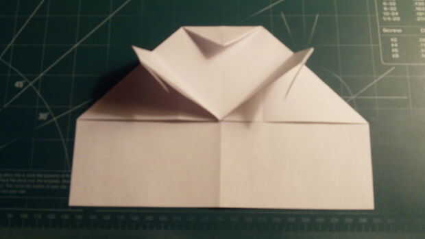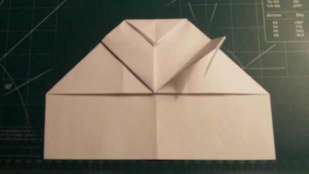 En el frente triangular, habrá un pliegue que es paralelo a la superficie de sustentación. Para comenzar a preparar su aterrizaje, dóblela para que se sienta en el lado del papel donde la cubierta doble no. Entonces cuando se hace esto, tire encima para que se sienta encima de los pliegues de la cubierta. Desde aquí, tire del papel de los bordes de la tapa de la cubierta hacia arriba y sobre este pequeño triángulo en la parte delantera. Cuando se tiran sobre el triángulo, tire de ellas hacia abajo para que la capa de la parte superior hacia abajo sobre el triángulo como se muestra. Despliegan los bordes del papel y luego insertar en las ranuras del triángulo. Cuando esto se hace, los bordes doblados hacia abajo para el tamaño del triángulo deben quedar dentro del triángulo a que se midieron. Cada uno en el abdomen, y este paso se completa.