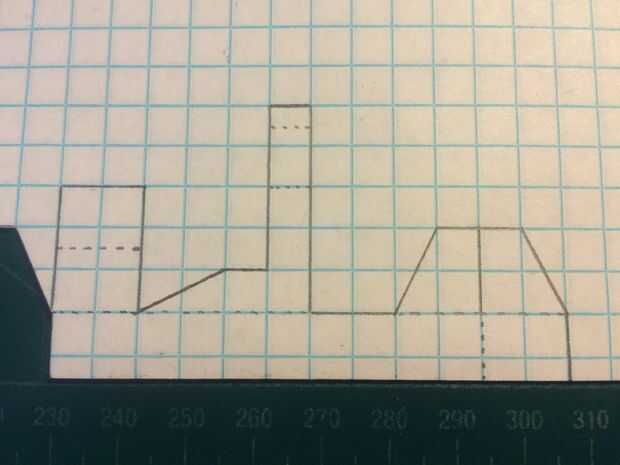 En primer lugar, comenzar por plegamiento eres tu papel milimetrado en la mitad (excepto tres cajas en el lado perforado). Una vez que el papel ha sido doblado adecuadamente, haga dos marcas--12 cajas completos apart (permite un cuadro más detrás de la armadura de avión). Use una regla para hacer una línea recta con una longitud de 12 cajas directamente a 1 fila de cajas de las dos marcas que acaba de hacer. Luego realizar los estabilizadores, largueros y contrapeso como se indica. Para evitar confusiones, se ha omitido una línea que se corta a lo largo de la fotografía.