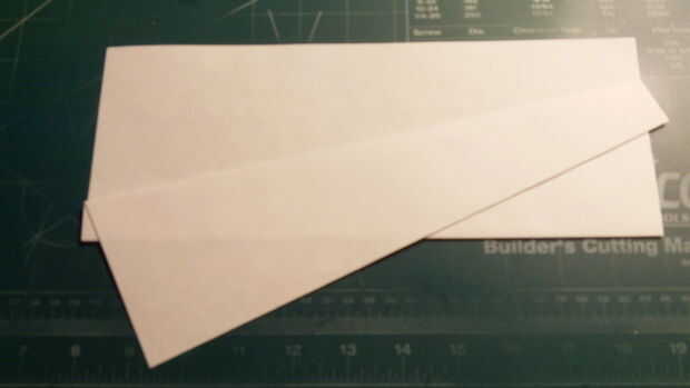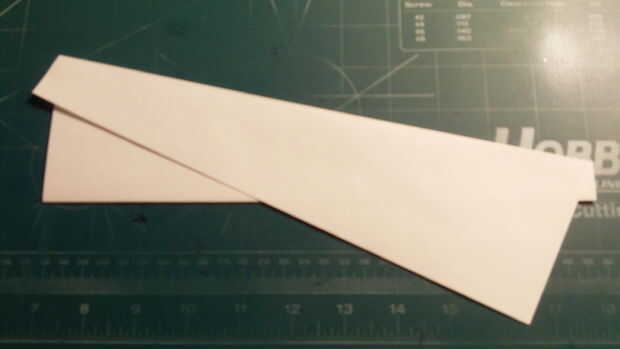 Fold your paper in half along its length. Mide 0,75 pulgadas por encima de este pliegue de centro en el borde del papel y haga una marca. Mide 1 pulgada en desde la punta del ala a lo largo del borde posterior y haga una marca. A continuación conectar las marcas con un pliegue diagonal y repita en el otro lado. Luego dobla el papel de la superficie de sustentación en el pliegue que acaba de hacer en cada lado como se muestra. Luego doblar los pliegues diagonales que hizo anteriormente.