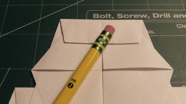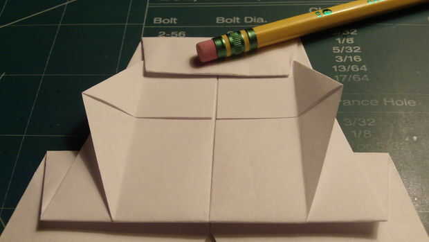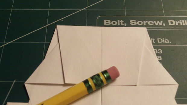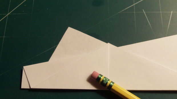 Tire de las aletas que sobresalen del papel hacia arriba y los pliegues para que queden al ras con el pliegue de centro en el fuselaje. Una vez hecho esto en ambos lados, tire del papel hacia abajo y hacia el centro como se muestra. Entonces se despliegan el pliegue de centro del fuselaje. Tire de la punta de la nariz hasta el borde de fuga. Desde el pliegue esto acaba, miden 1 pulgada hacia atrás. En esta marca, revertir el doblez y el tirón hacia atrás hacia adelante; luego pliegue. Ahora tire de la punta de la nariz hasta los bordes rectos de los estabilizadores. Luego desdoblar y doblar la punta de este pliegue y luego voltear el primer pliegue de esta serie, como se muestra. Doblar los canards como se muestra, sus bordes deben ser doblados hasta que hay no más para ser doblado y la alineación debe ser con los bordes rectos de las aletas de los canards.