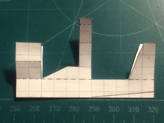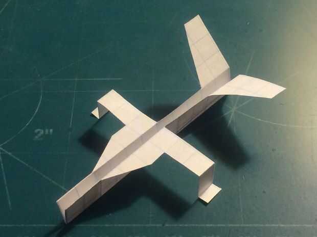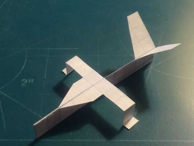 Cortar el fuselaje y doblar el contrapeso en el fuselaje. Doble hacia abajo los estabilizadores horizontales, tren de aterrizaje y mástiles. Una vez hecho esto, aplicar cinta de designado. Después de grabar todos señaló puntos, cortadas donde se muestra.