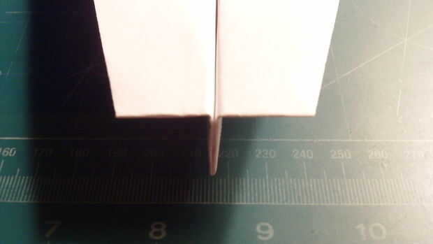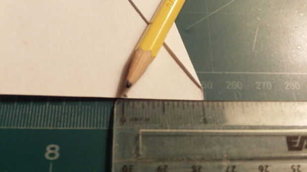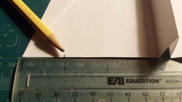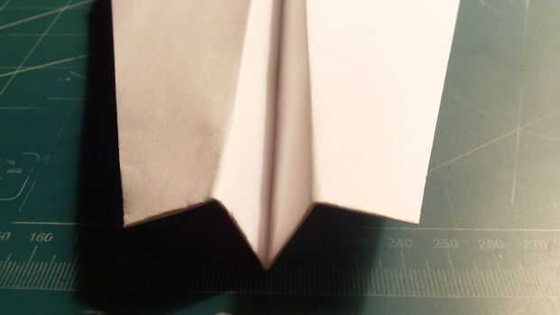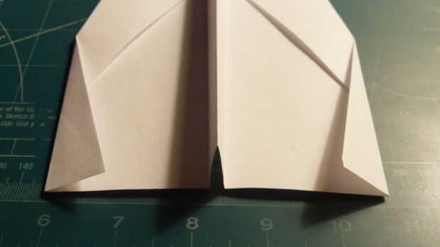 Unfold the two wings. Luego use su lápiz y regla para encontrar y marcar 1 pulgada en de los extremos del ala en cada lado. A continuación tire de los extremos hacia adentro y alinee los bordes de fuga con los del ala. Luego realizar pliegues en las marcas. Una vez que se doblan dos aletillas, despliegan y voltee la armadura de avión. Cinta el aguilucho en su frente, atrás y a través de su raíz cerca del borde posterior del ala.