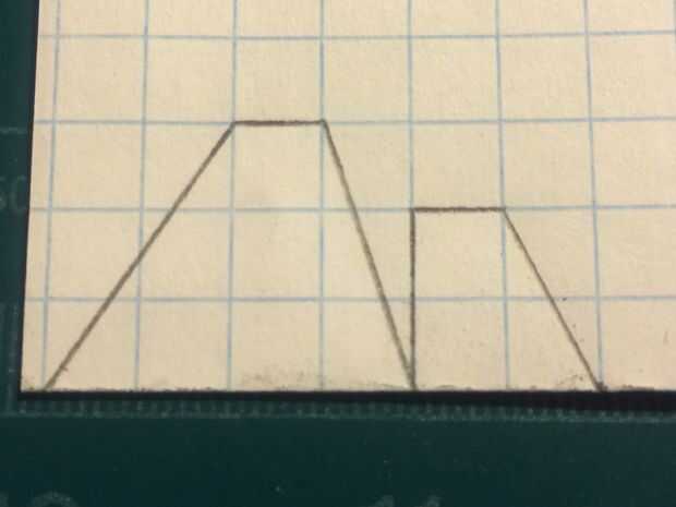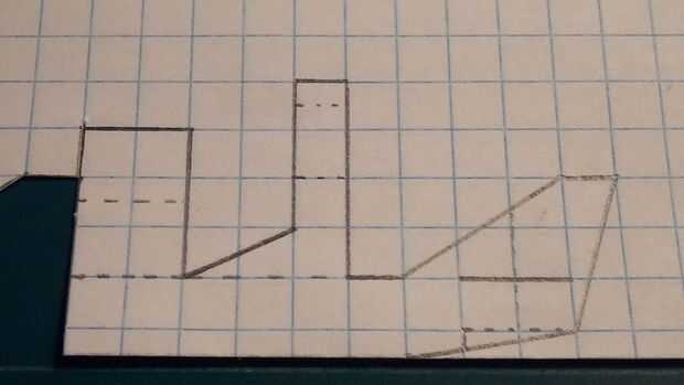 Después de que el fuselaje se hace, tomar otra hoja de papel que se dobla por la mitad a lo largo de las líneas de cajas. Marcar el ala como se muestra (eliminado de un barrido de borde de ataque de 2 cajas de acorde cada 3 cajas de luz, y un borde de salida de 1 caja de acorde eliminado cada 3 cajas de luz). Adicionalmente, la medida 2 cajas a lo largo del pliegue y 2 cajas arriba de un lado y hacia adelante el 1 cuadro. Luego trace una línea diagonal que conecta esta línea el otro borde de la línea a lo largo del pliegue. Esto hará que los estabilizadores horizontales. Luego recórtalo.
