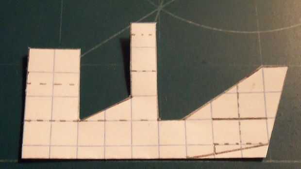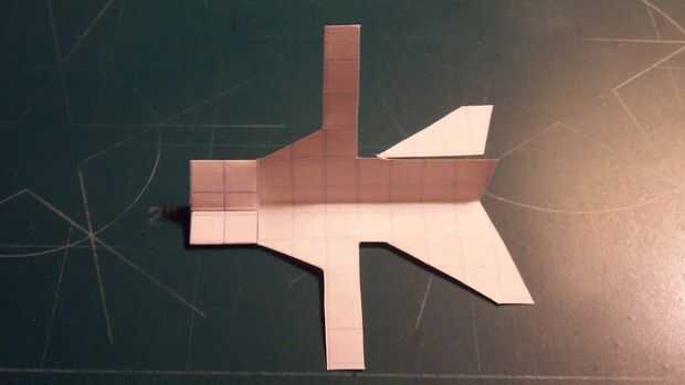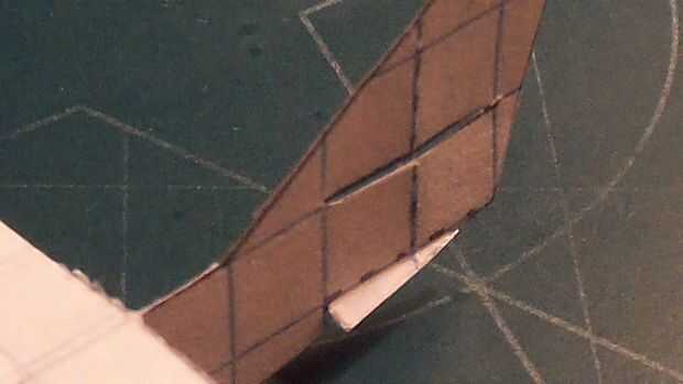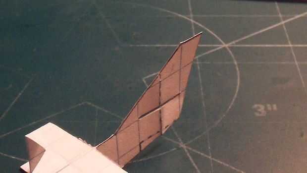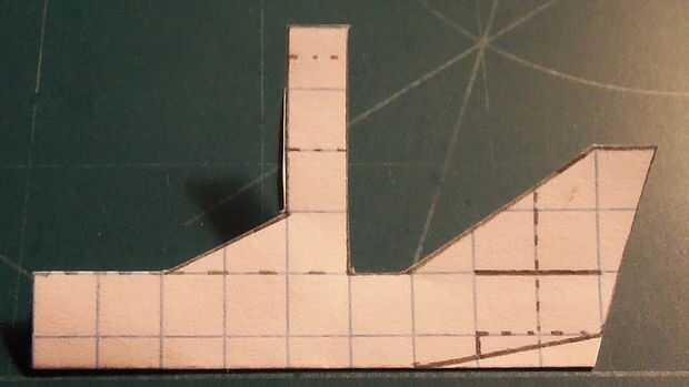 Comenzar a construir el fuselaje doblando los contrapesos en el fuselaje. Una vez han sido doblados, revelan el fuselaje y cortar el estabilizador vertical derecha. Una vez hecho esto, restaurar el pliegue. Después de hacer esto, doble estabilizador vertical hacia adelante a lo largo de la línea de puntos que indica el centro de lo que será ser la ranura de los estabilizadores horizontales, luego se corta. Después de este corte, corte la parte inferior del fuselaje debajo de la línea diagonal de la parte trasera del fuselaje. Después de este corte, corte a lo largo de la línea vertical de las aletas ventrales. Aplique cinta de designado y las aletas ventrales del doblez como se muestra.