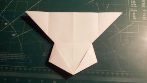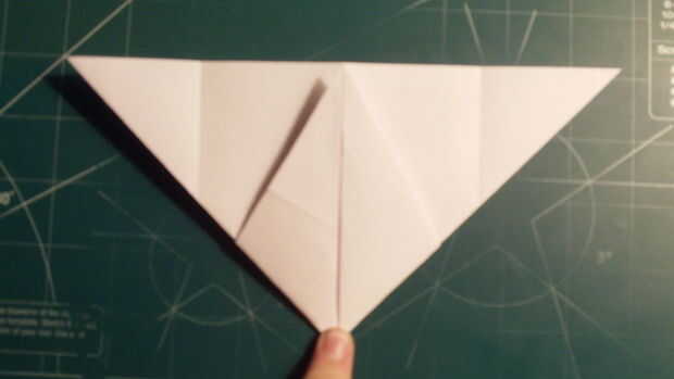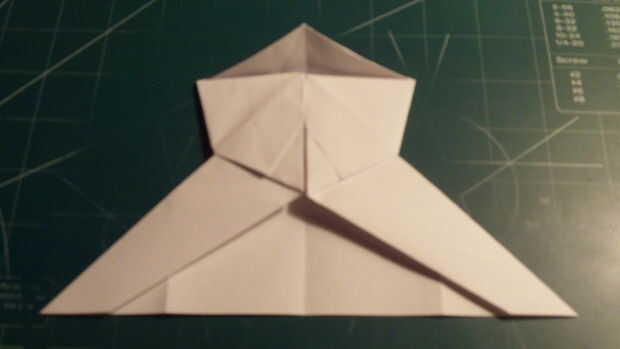 De su posición en el último paso, el aeroplano de papel debe tener el lado opuesto hacia arriba. Desde allí, abra los pliegues y luego aplanarlos. Después de eso, darle la vuelta para que el otro lado ahora es hacia arriba. Pliegue la sección triangular pequeña de papel en la solapa de canard.