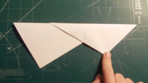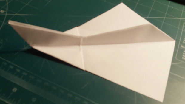 Doblar el triángulo hacia abajo sobre la raíz del ala. Luego doblar el pliegue de seguridad por el centro y sobre las alas, doblar hacia abajo. Luego doblar el papel alrededor del ala, debe ser repetido entonces doblado en la nariz. Entonces grabado juntos y en el fuselaje.