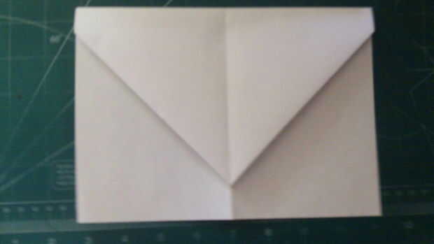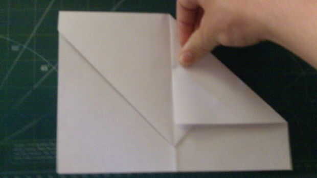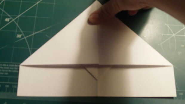 Tire de la parte superior hasta 1 pulgada por encima de la parte trasera de la aeronave. Luego vuelva a tirar los rincones en el centro. Repetir en el otro lado, y luego tire de la tapa de la cerradura de triángulo sobre los dobleces de dos esquina. Luego doblar a lo largo de la línea central en la mitad.