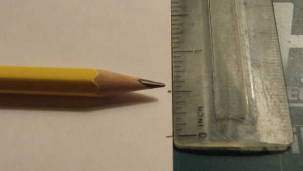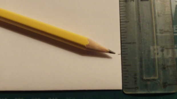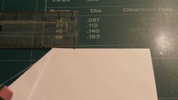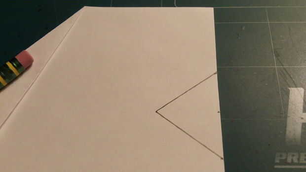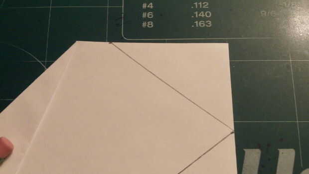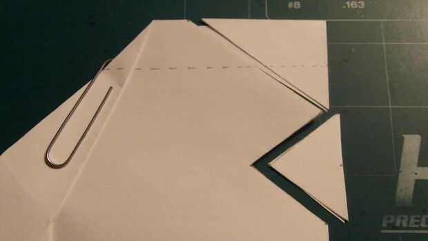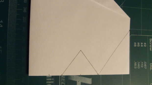 El avión del doblez por la mitad a lo largo de su doblez de centro. Mide 0,75 pulgadas por encima del doblez de centro y haga una marca (marca A). De esta marca, medir una más 0.5 pulgadas hacia arriba a lo largo del borde posterior y haga una marca (marca B). Desde este punto, medir 0,75 y 1,5 pulgadas hacia arriba y hacer marcas en cada (marcas C y D). De la pulgada 0,75 punto, medida 1 pulgada perpendicular al borde de fuga y haga una marca. De esta marca, hacer líneas a las marcas B y D. Una vez hecho esto, medida 0.5 pulgadas desde el borde de ataque en el extremo del ala y haga una marca (marca E). Luego conecte las marcas D y E con una línea. Medir 0,75 pulgadas desde el extremo del ala a lo largo del borde posterior y luego medida perpendicular al borde de salida y una línea de puntos. Cuando este concluida la corte a lo largo de todas las líneas de sólidos como se muestra. Puede desechar las piezas cortadas por esto.