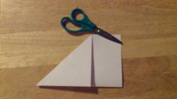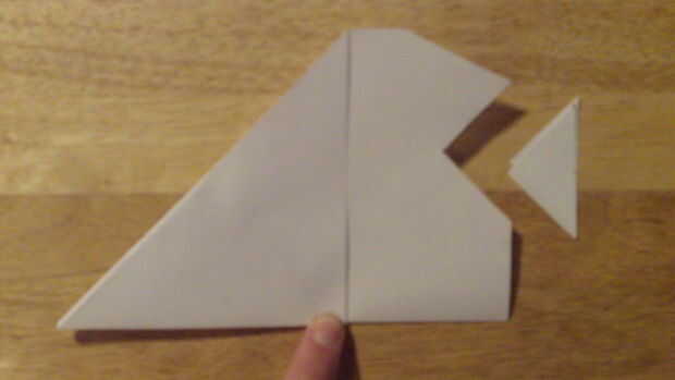 Comience a la forma "sigilosa" de su fantasma por el corte de la marca de 1,5 pulgadas en la punta del ala a la marca de 3,5 pulgadas en el borde de fuga. Deseche las sobras del ala. De la marca de 3.5 pulgadas, corte hasta la marca de 1 pulgada en el ala por encima de la marca de 2,5 pulgadas. Desde punto, corta al punto de 1,5 pulgadas en el borde de fuga. Luego tirar el papel de desecho.