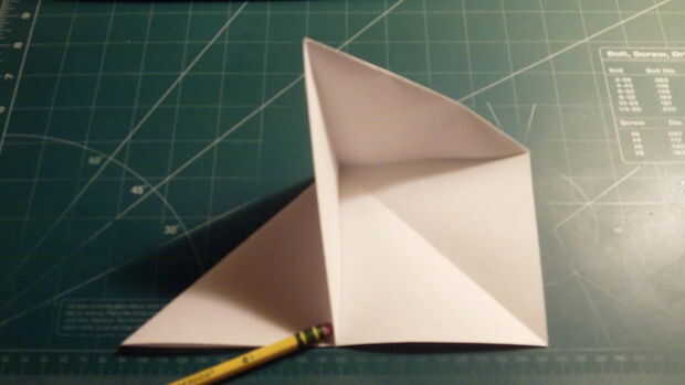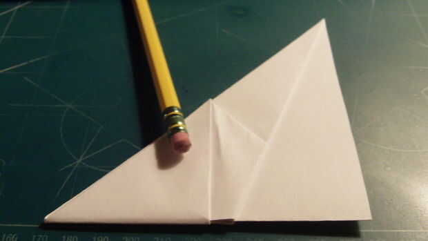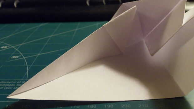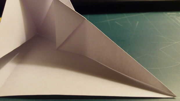 Doble las esquinas hacia abajo en una mitad de la hoja. Luego a lo largo de los pliegues se hizo previamente, tire del papel en y sobre sí mismo como se muestra. Una vez hecho esto, un rombo de papel debería haber sido creado. Tire de la parte posterior de este diamante ventral hacia adelante a su contrario y meta después de hacerlo. Luego, pliegue y pliegue perfiles debajo de manera que sus bordes posteriores toquen los bordes principales del ala. Luego pliega el papel por la mitad.