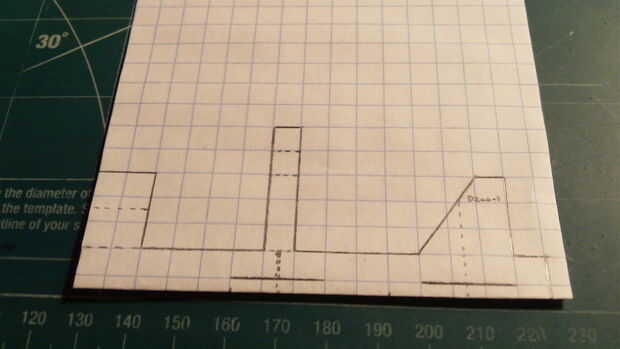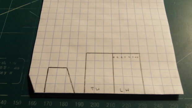 En primer lugar, comenzar por plegamiento eres tu papel milimetrado en la mitad (excepto tres cajas en el lado perforado). Una vez que el papel ha sido doblado adecuadamente, haga dos marcas--15 cajas full apart. Use una regla para hacer una línea recta con una longitud de 15 cajas directamente a 1 fila de cajas de las dos marcas que acaba de hacer. Luego realizar el timón, palos, aterrizaje y contrapeso como se indica. Siga las marcas de la fotografía. A lo largo de los largueros, hacer un punteado una caja en la punta y otra línea punteada la línea hacia adentro de la caja más una. Bajo las perchas y una caja de longitud hacia adelante y atrás de él hacen una línea sólida con una línea de puntos lo bisecan medio una caja en de los bordes de los largueros de arriba. Entonces, bajo el timón, marque una línea que se extiende 3 cajas. cajas de 1,5 desde el comienzo de esta línea, hacer una línea de puntos vertical. Una vez que todo está marcado hacia fuera, cortar el fuselaje.
