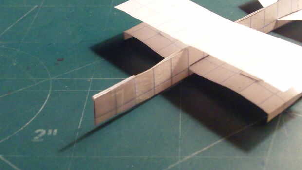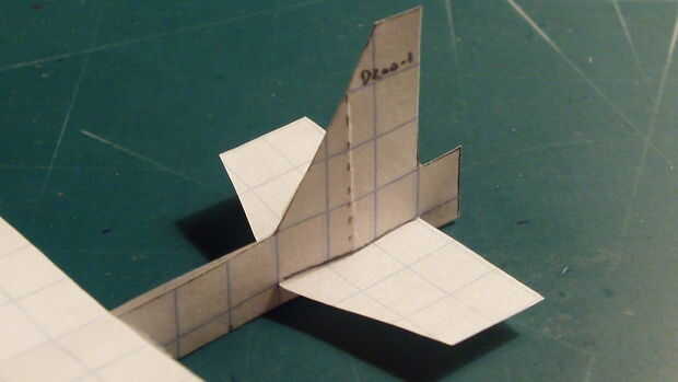 Cortar los estabilizadores horizontales que hiciste anteriormente y tire una mitad a través del corte formuló bajo el estabilizador vertical. Luego doble hacia arriba y aplique cinta para fijar en el fuselaje. Entonces despliegan con una leve desviación de diedro. Proceder a la doble contrapeso y aplique dos grapas, una de cada lado. El gorrión está ahora listo para el vuelo.