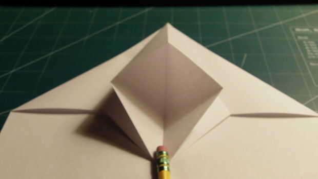 Tirar las puntas superiores de la tapa de la cubierta hacia atrás cuáles fueron sus bordes delanteros a la línea de centro. Luego tire de ellos hacia arriba después de arrugar. Abrir y luego tire de la mitad para que la línea cumple el centro como se muestra. Tire su correspondiente mitad hacia y encima de ella. Repita este proceso en el otro lado. Entonces debe tener un papel por encima de estos dos pliegues restantes.