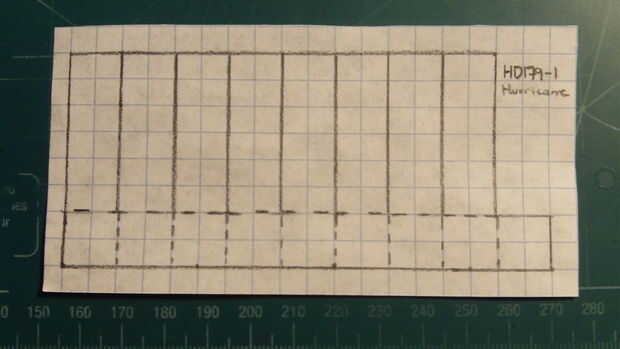 Empezar a hacer su huracán marcando una caja de 16 por 8 cajas, con un afloramiento adicional de 2 por 2 en una sola hoja de papel cuadriculado. En la parte superior, marca un sólido línea 6 cajas de longitud, cada 2 cajas de las esquinas de la caja principal. De esta línea, marque una línea de puntos que se extiende desde el lado de las casillas al otro, incluyendo el afloramiento. Por debajo de la intersección de líneas verticales con la linea horizontal, extenderlos como líneas punteadas.